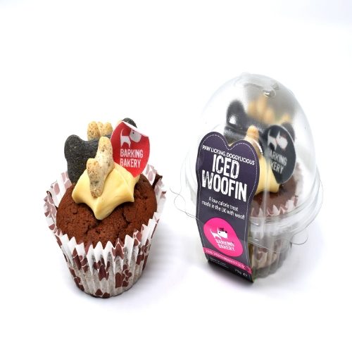 A single Carob Iced Vanilla cake doggy cupcake treat. Something really pawsome. Made to be shared or for the larger of our furry friends...our light sponge, topped with a tail-swishing swirl of famous yoghurt frosting and decorated with crunchy bones and edible disc in a paw print muffin wrapper. Packaged in a super clean, food grade pod that is 100% recyclable and made with 80% minimum recycled plastic.